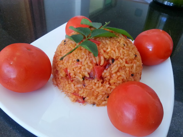 Now add the chopped tomato and saute it well. When it becomes mushy add a little salt and mix well. Now add the cooked rice, mix well. Check salt and garnish with curry leaves. Serve it with potato chips or kondattam!!